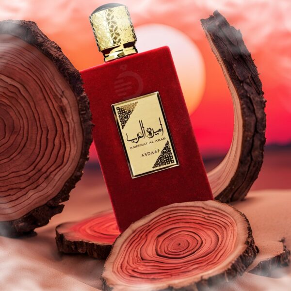 Su frasco aterciopelado en color burdeos con detalles dorados refleja lujo, distinción y feminidad, haciendo de Ameerat Al Arab un perfume digno de una princesa.