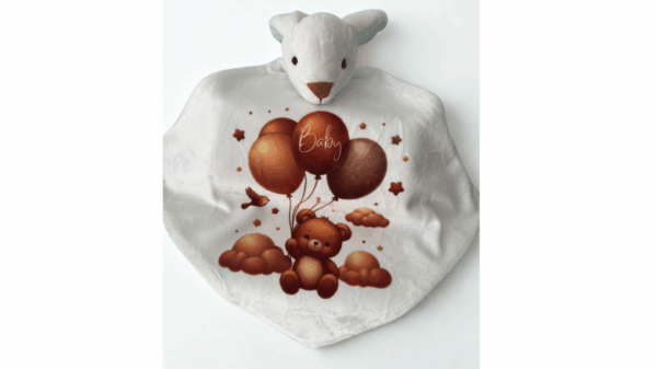 El compañero ideal para los primeros mimos. Este adorable dou dou combina la suavidad de una mantita con la dulzura de un peluche, convirtiéndose en el mejor amigo de tu pequeño desde sus primeros días. Su diseño presenta un tierno osito con globos y la palabra Baby, rodeado de estrellitas y nubes en tonos cálidos.
