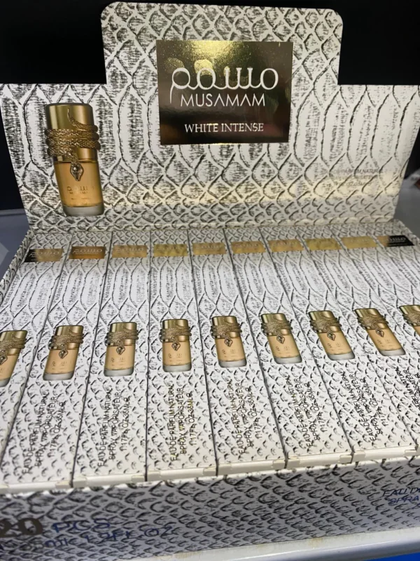 Con su frasco dorado decorado con una elegante serpiente, Musamam White Intense Mini representa el lujo y la sofisticación en cada gota.